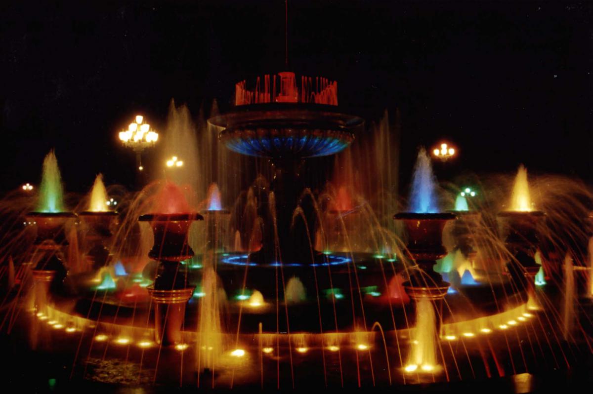 Город в сиянии огней. Призрачные, как будто паряшие назд землей величественные здания, переливающиеся сверкающим разноцветьем веселые брызги фонтанов, бегущие ослепительные блики, отражаюшиеся в пруду... Огни, огни, огни....